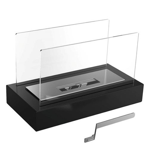 Изготовленный из стали, он защищен двумя стеклянными экранами и доступен в белом или черном цвете. Легкий вес, его можно переносить из комнаты в комнату. Он хорошо смотрится в любом интерьере, не занимает места и не бросается в глаза. Линия огня длиной 15 см горит равномерно и мягко. Топка здесь небольшая, всего 200 мл топлива, что означает непрерывное горение не более двух часов. В комплект входит кочерга для закрытия заслонок, чтобы при необходимости погасить пламя. Стеклянные панели привинчены к боковым сторонам и служат не только защитными экранами, но и опорными стойками.