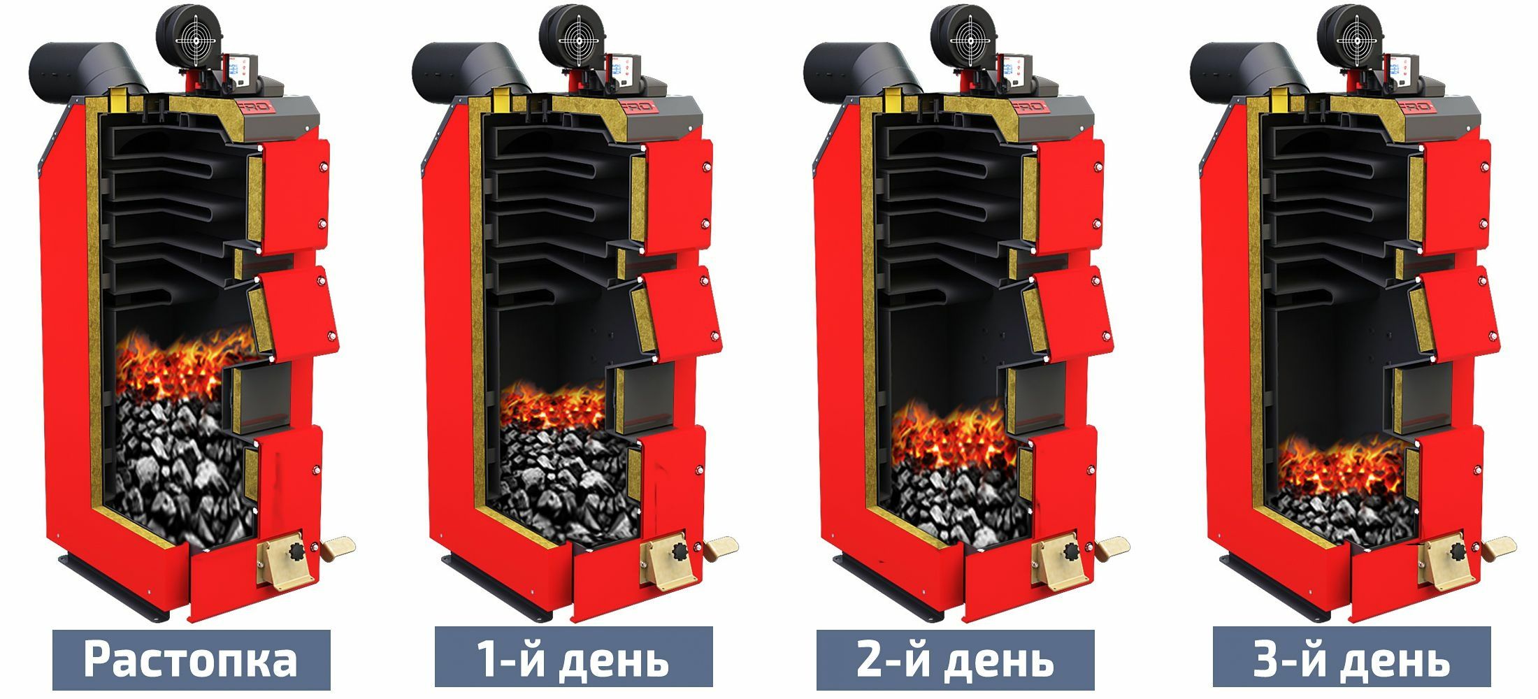 Такие котлы более эффективны и поэтому экономят больше топлива (в среднем на 10-15%). Среднее время горения куска древесины составляет 10-12 часов, но в некоторых моделях оно может достигать 20-24 часов. В стандартных популярных моделях уголь горит в среднем 24-40 часов, но есть и модели, которые горят до 7 дней. Поэтому предпочтительнее отапливать их углем. Цены на эти котлы начинаются от 50-60 000 рублей.