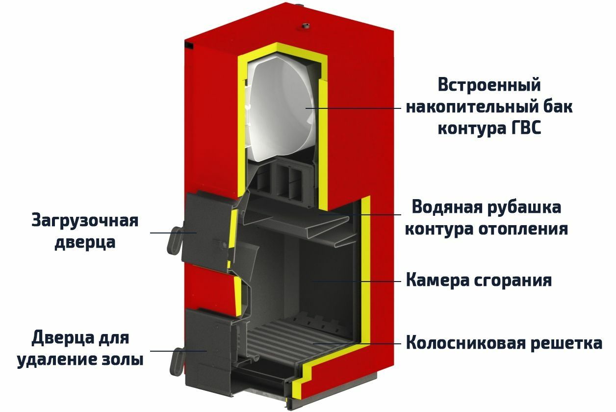 Однако важно понимать, что продолжительность горения зависит от типа топлива. Если производитель заявляет, что котел способен непрерывно сжигать топливо в течение 3 дней, это означает, что такие характеристики могут быть достигнуты при использовании хорошего каменного угля с низкой зольностью (до 15%), а еще лучше - древесного угля. Дрова в таком котле сгорают в течение 8-16 часов. Еще одним недостатком этой конструкции является отсутствие на рынке двухконтурных моделей длительного горения.