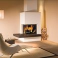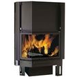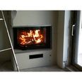 Левая стенка топки короткая, отдана под скошенную дверцу. Дверца угловая, подъемная, из жаропрочного стекла, через которое можно любоваться игрой живого пламени и следить за сгоранием дров. Состоит из двух частей: фронтальной и повернутой под углом 45°С, что увеличивает вид на огонь.