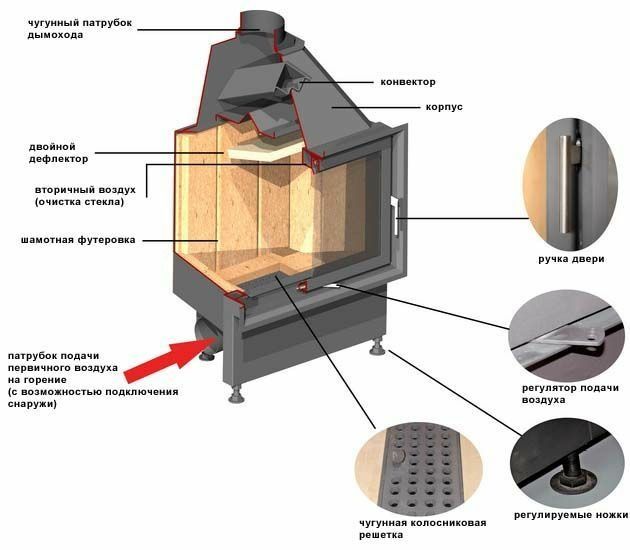 Стальные топки внутри выложены огнеупорным материалом. В недорогих моделях для футеровки используется шамот (обожженная глина), в дорогих - керамика или натуральный вермикулит.