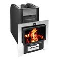 • Топка имеет выносной топливный канал, позволяющим топить баню из комнаты отдыха или другого смежного помещения. Дверца топки имеет большой прозрачный экран диагональю 45 см., позволяющим наблюдать за живым огнем.