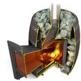 C помощью съемной корзины для камней печь позволяет регулировать конвективные потоки, тепловое излучение и теплоаккумулирующие свойства. Закладывая камни только в корзину или в корзину и в пространство между топкой и внешним кожухом, можно добиться работы печи в любом режиме - сухом или влажном.