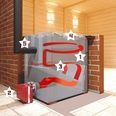 Геометрия каменки разработана таким образом, чтобы обеспечить равномерный нагрев большого объема камней (300 кг!) и получить много лёгкого пара. Факел пламени горелки равномерно прогревает нижнюю часть ёмкой каменки. Раскаленные дымовые газы совершают несколько оборотов в сложной системе газоходов, благодаря чему тепло эффективно передается боковым стенкам каменки и аккумулируется в камнях. О высоком КПД печи свидетельствует и сравнительно небольшая температура газов на выходе дымохода — всего около 200°С.