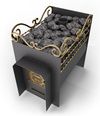 Дровяная печь для бани серии Сабантуй имеет эксклюзивный дизайн, с кованными элементами и национальным башкирским рисунком. Печь способна отапливать предбанник и рассчитана под обкладку кирпичом. Максимальная площадь отапливаемого помещения 26 м3. Труба изготовлена из стали марки 09Г2С. Печь топится сухими дровами. Дверца из чугуна. К печи подключается дымоход диаметром 115 мм.
